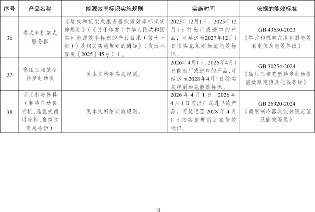 《高压三相笼型异步电动机能源效率标识实施规则》《商用制冷器具能源效率标识实施规则》自2026年4月1日起实施,有效期5年。2026年4月1日前出厂或进口的产品,可延迟至2028年4月1日按实施规则加施能效标识。