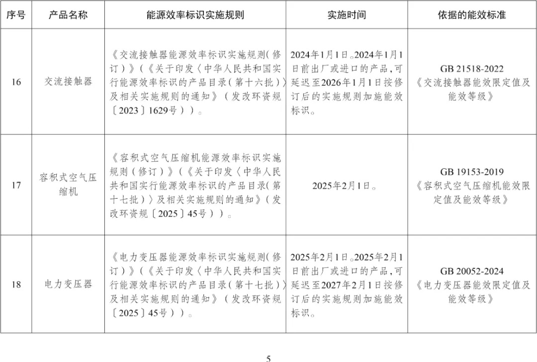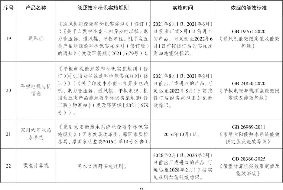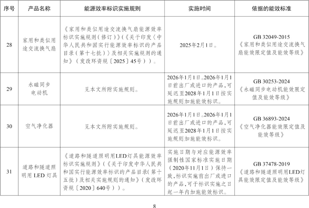 《永磁同步电动机能源效率标识实施规则》《空气净化器能源效率标识实施规则》自2026年1月1日起实施,有效期5年。2026年1月1日前出厂或进口的产品,可延迟至2028年1月1日按实施规则加施能效标识。
